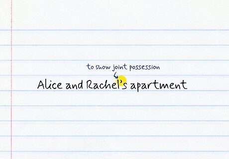 Add an apostrophe and an S to the end of a group of nouns to show joint possession. If a group of nouns all own the same thing, only add an apostrophe and the letter S to the end of the last noun in a group. This applies to a group of two or more. Ex: Jeff, Amy, and Frank’s parents Ex: Alice and Rachel’s apartment Ex: Mike and Robin’s cat