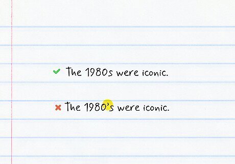 Do not use apostrophes to make words plural. If you’re trying to make a word plural, simply add the usual suffix, like ‘s’ or ‘es.’ This includes words that already end in an S, as adding an apostrophe would make them possessive rather than plural. Ex: the plural of the last name “Johnson” is “Johnsons,” not “Johnson’s” Ex: If you have more than one apple, write “apples,” not “apple’s.” This includes acronyms, like “CD.” The plural form of CD is “CDs,” not “CD’s.” To make a year plural, like 1980, write “1980s” not “1980’s.” The wrong use of an apostrophe to form the plural is called the greengrocer's apostrophe since grocers are often the worst (or at least the most visible) offenders.