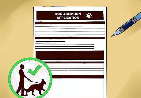 Provide basic information on the adoption application. Once you have located an adoption agency and decided the breeds you are interested in, you should complete the adoption application. Most adoption agencies will require you to complete the application as part of the adoption process. The application will require basic information such as the name or names of the dogs you are interested in adopting as well as your personal information. You will also need to specify your living situation, such as whether you live in an apartment, a condo, or a home. They may also ask to see proof from your apartment or rental property verifying that dogs are allowed to live there. You may need to note if you live alone, with a partner, or with a family. The application may also ask you if you have a fenced yard or access to an outdoor area for the dog, as well as how much time you will be able to spend with the dog each day.