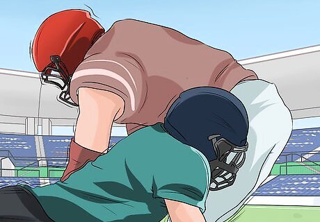 Practice rugby-style tackling. Rugby-style tackling is gaining headway with college and professional football players because it is safer than football-style tackling. By tackling this way, you are protecting your own head and the opposing teammate's head as well. To practice rugby-style tackling, you use your shoulder to take down other players near the hip or thigh.