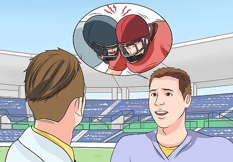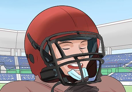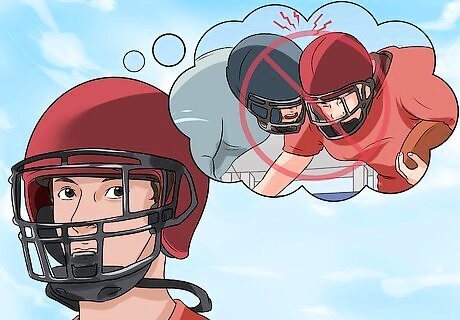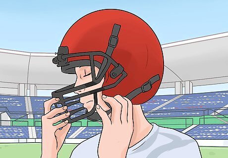 Wear a helmet and wear it correctly. Helmets are one of the first lines of defense when it comes to preventing and avoiding head injuries in football. Players need to wear helmets at all times, even during practice to ensure they avoid any injuries. Some studies have shown that wearing a helmet can reduce the risk of head injuries by over 80%. If you or your child is just starting football, make sure to spend time with the coach to learn how to get fitted for an appropriate helmet and how to wear it correctly. Players always need to wear a helmet, even in times of practice when they think it may be unlikely to get an injury. Note that although helmets are one of the best defenses to head injuries, helmets are not designed to completely prevent head injuries. Unfortunately, there is no "concussion-proof" helmet.
