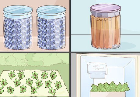 Preserve fresh produce if you have excess. There are plenty of ways to store excess fresh produce so that you can enjoy it throughout the different seasons. Depending on the types of fruits, vegetables, or herbs that you have, you can try your hand at canning, fermenting, drying, or freezing. Use a search engine or get a book out from your local library to find out the best way to store your specific produce. Tomatoes, cucumbers, berries, and green beans can all be canned well. Try fermenting cabbage, carrots, radishes, and garlic. Basil, thyme, apples, and apricots all dry well. Try freezing spinach, pumpkin, onions, and berries.