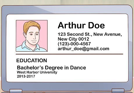 Put together a dance resume. Just like any other resume, a dance resume should highlight all of your relevant skills and experience, along with a few references. However, you should also include where you trained, what choreographers or companies you’ve worked with, and any industry-related awards or standout roles you earned. Remember to put your contact information at the top of the page so the employer can contact you if you’re chosen for the position! Keep your resume short—it should only take up one side of one sheet of paper. If you have more experience than you can fit on one sheet, focus on the experience that’s most recent and most relevant to the position you want.