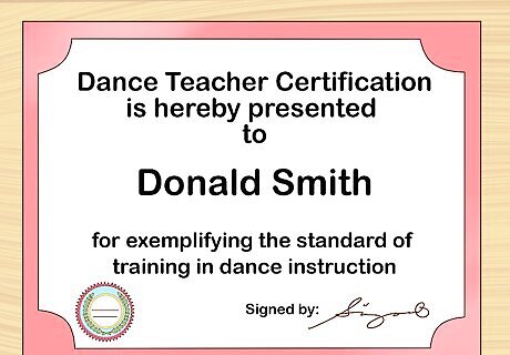 Pursue a dance teacher certification to teach at a private studio. Many individually-owned studios have their own requirements for teachers. If there’s a dance studio near you where you’d like to teach, contact the owner and ask them what certification you would need to work there. They may offer a certificate program through the school, or they may have you become certified through an independent organization. Some studios will have more stringent requirements than others. In some cases, the studio may only want you to demonstrate your dance experience, especially if you’re applying for a part-time or assistant position, or if it’s a non-competitive local dance studio. In the UK, you will most likely need a specialized qualification from the Council for Dance Education and Training. In the US, programs vary. Some popular dance teacher certification groups are the Royal Academy of Dance, the American Ballet Theatre, the National Dance Teachers Association of America, and the American Tap Dance Foundation.