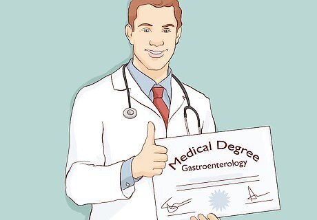 Enroll in a fellowship for gastroenterology. After your residency, you have one final course of training before becoming a licensed gastroenterologist. Fellowships provide advanced training with recognized specialists in the field. These programs expand your technical knowledge about gastrointestinal diseases and treatments, as well as give you more practice in caring for patients independently. After completing your fellowship, you’ll be eligible for board certification as a gastroenterologist. Professional organizations like the American College of Gastroenterology or American Gastroenterological Institute post fellowship positions, so look on these sites for fellowship opportunities. Fellowship applications usually involve writing a personal and professional statement, sending your transcripts and diplomas, and getting letters of recommendation from your past mentors. Fellowships may last 1-3 years, depending on the program.