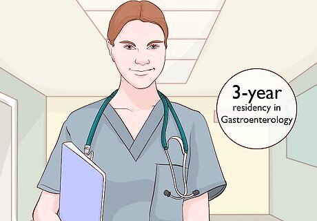Complete a 3-year residency in gastroenterology. Residencies place you in a hospital or clinic to work under a licensed physician. As a resident, you’ll gain hands-on experience applying what you’ve learned in medical school to real-world situations. This is where you’ll start becoming an expert in gastroenterology and treating patients. Pay attention to everything your mentor does and ask any questions that come to mind. When you complete your residency, you’ll be a significant step closer to becoming a full gastroenterologist. Duties of a resident vary depending on the program. In the early stages, you’ll just shadow the physician on staff as they go about their daily rounds. As time goes on, you’ll have more independent tasks like interviewing patients and serving on committees. Be prepared to work long hours during your residency. Residents usually work full days and are sometimes on call during overnight shifts. This is all to prepare you for the stresses of working in the medical field. The length of the residency may vary, but 3 years is a common timeframe.