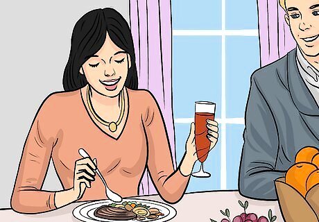Eat with care. While eating food, be careful that you don't spill any on your clothes. A stained dress won't impress anyone!