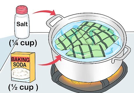 Heat and soak on the stove with salt and baking soda. This can be an especially good option for small linen items like napkins or handkerchiefs. Place the linens in a large pot of water and add ¼ cup salt and ½ cup baking soda, mixing both in well with the water. Place on the stove. Bring to a boil, and then turn off the burner. Leave these on the stove for 2 to 3 days. You might want to change the water a couple times, but it is not absolutely necessary. You can also reheat the water a couple of times to boost the effect.