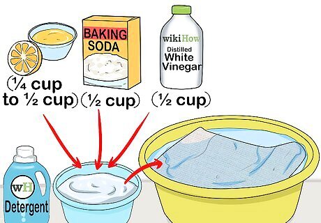 Use non-bleach alternatives in your laundry. Since bleach irritates a lot of people’s skin, it can be helpful to try out more natural alternatives which you can add right into your regular laundry loads. Lemon juice, vinegar, baking soda and hydrogen peroxide are all good stain removing and bleaching remedies. These are obviously less harsh methods, so they may also be less powerful than chemical bleach. Try adding ¼ cup to ½ cup of lemon juice, ½ cup of baking soda or hydrogen peroxide (3%), or ½ cup to 1 cup of distilled white vinegar to your regular detergent. To pre-treat the stains before washing, you can use a solution made out of ½ cup of baking soda, ¼ cup of liquid dish soap, and 4 cups of water.