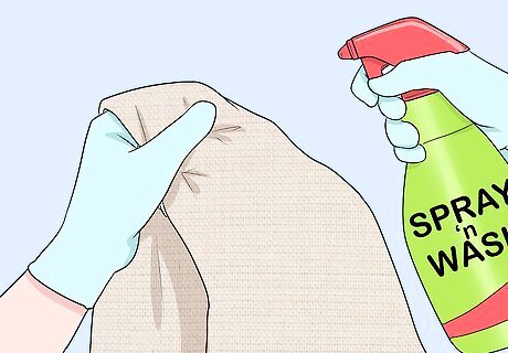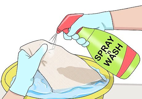 Treat stains. Once the linens have soaked for a while, check them for remaining stains that need further treatment. Use a modern enzyme stain treatment like Spray 'n Wash or Shout. These modern stain removers have made many traditional methods obsolete. Spray a liberal amount on specific spots that need treatment. Allow the stain treatment to soak into the cloth before moving on. It is recommended to never use chlorine bleach, even as a spot treatment, on linens because it can cause yellowing and deteriorate the fabric. In general, linen releases stains better than other fabrics do, so you may not actually need to do any further treatment besides soaking.