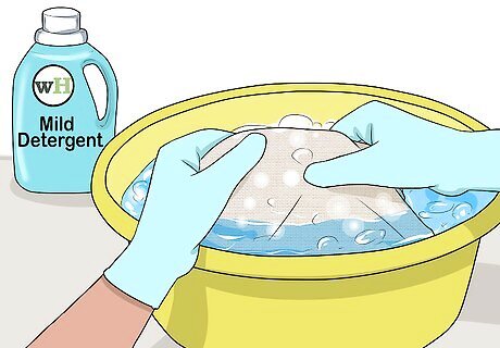 Wash the linen. If you are working with linen that is vintage or delicate, washing by hand is almost always what you want to do. Washing machines can be abrasive because of the rapid violent movement, especially machines with a center agitator. Use gentle washing motions; never twist or scrub the linen. Wash it with warm water, a basic mild detergent, and powdered oxygen bleach. Follow the instructions on the bleach product, but in general it is concentrated pretty highly and you shouldn't need too much, only about one filled scoop. Be sure to separate white linens from dark or colored linens to avoid any bleeding of the colors or fading of the white linens. An example of mild detergent would be something recommended for use on baby clothes like Dreft or All Free and Clear. Oxygen bleach is usually made with sodium percarbonate, so you can look for this in the ingredients when buying. Oxi Clean is a pretty standard bleach to use. If you are washing by hand, it is highly recommended that you wear rubber gloves to protect your hands from the chemical reaction of the bleach. If you wash linen in a washing machine, make sure it is on the gentle cycle.