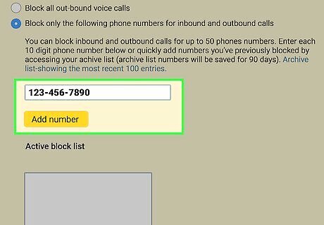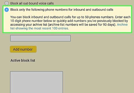Click Block only the following phone numbers…. It's the last option on the "Block Voice" menu. This option allows you to create a list of numbers that are blocked from inbound and outbound calls. Other options you can select include the following. Block all inbound calls. Block all inbound and outbound calls. Do not block any voice calls. Block all outbound voice calls.