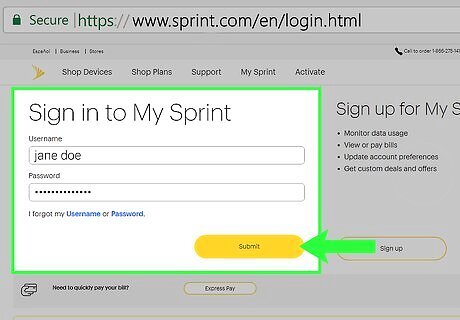Type the username and password and click Submit. You will need the username and password associated with your Sprint account. Type them in the spaces provide and click the yellow button that says Submit. This logs you into the Sprint website. If you do not have official permissions to change your account on Sprint.com, you will not be allowed to change data or voice settings. Ask your account manager to change them for you. If you cannot remember your username or password, call 1-888-211-4727 to contact customer service.
