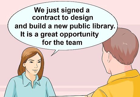 Discuss your achievements in a team-centered way. Bragging often has a competitive and self-centered edge to it, but sharing credit for your accomplishments can minimize the potential for seeming arrogant. Research has shown that listeners feel more positively about people who use inclusive language (such as “we” and “team,”). For example, if you work at an architectural firm and your team just got a contract for a new building, be sure to use "we" instead of "I" when talking about the accomplishment. "After several months of hard work, we just signed a contract to design and build a new public library. It is a great opportunity for the team" sounds better than "I just scored an awesome contract to build a new building. It is going to cement the rest of my career."