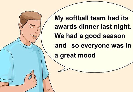 Turn a bragging statement into a positive statement. By using team-oriented language and mentioning your accomplishments but spinning them in a more modest way, you can sound positive and talk yourself up without bragging. One example of a statement worded as either bragging or as a simple positive statement is as follows: The positive version: “My softball team had its awards dinner last night. We had a good season and so everyone was in a great mood. I even got the most valuable player award. Boy, was I surprised. I played really hard this summer, but I did it for the fun and the exercise. So I was really pleased to get the award and the recognition. I was glad to help my team finish the season so well.” The bragging version: “My softball team had its awards dinner last night. I had my best season yet, so I was in a great mood. They gave me the most valuable player award. But that was no surprise since I was the leading player all summer. Actually, I'm the best all-round player this league has ever seen. I could have my choice to play on any team I want next year, so I may be changing to a better team.”