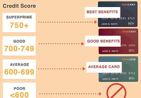 Apply within your means. If lenders see that you have made multiple applications for credit, this will affect your score and reduce your likelihood of receiving a card. This can reduce your score by as much as 10%. You should be aware of what your credit score qualifies you for and apply exclusively for cards that you are likely to get. American Express does not release what credit scores will qualify you for which cards. A credit score of 700 or up will qualify you for a majority of cards, including some cards with very good benefits. If your credit score is anywhere from 600 to 700, you can likely get an average credit card, but might have some difficulty. It is improbable that you will get a card with great benefits. If available, research the average credit score of those receiving a card that you are considering applying for. Do not apply if the average is much above your own credit score. If your credit score is under 600 it is unlikely that you will receive a credit card. Instead, you should start out by becoming a cosigner on someone else’s card or by getting a secured card. Note that you cannot become a cosigner on an American Express account.