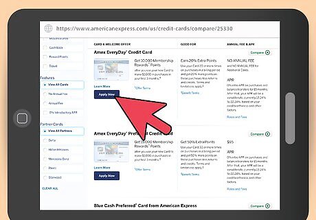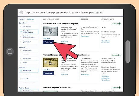 Apply for an American Express credit card. A credit card, unlike a charge card, will allow you to carry a balance and pay over time. Because of this, you usually need a higher credit score to be approved for an American Express credit card than you do for a charge card. (American Express does not release information regarding credit scores necessary to be approved for a card.) American Express offers a range of credit cards, which include various benefits such as travel miles, cash back, or business accounts. American Express has a "Choose a Card" feature that can help you choose which card is right for you. You may have better chances of being approved for an American Express credit card if you apply for a card through your bank, where you have an account in good standing. Bank of America, Citi, Wells Fargo, USAA, First National Bank, Barclays, and PenFed all issue American Express cards.
