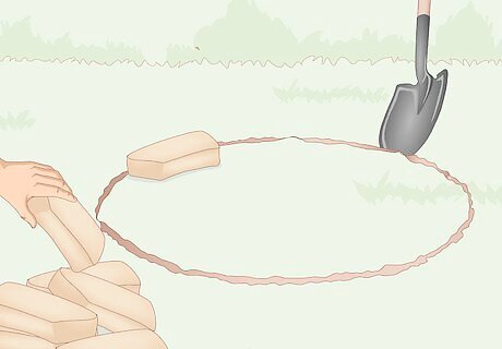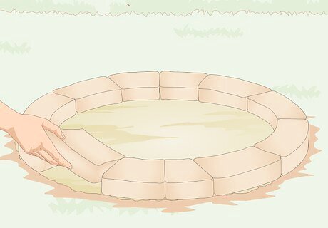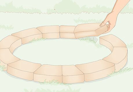 Lay out 12 retaining wall blocks, facing outwards, in a ring at the site. Place 1 wedge-shaped block flat on the ground with the narrow side of the wedge facing inwards towards where you want the center of the pit to be. Proceed to lay out the fire ring with 11 more blocks, adjusting them as you go to make them fit neatly together in a perfect ring. You can adjust the number of blocks if you want to make the fire ring bigger or smaller. You can use concrete retaining wall blocks for a basic, more economic option, or some kind of natural stone for a fancier, more rustic-looking ring. Avoid porous rocks like sandstone and limestone because they can explode easily when they get hot.