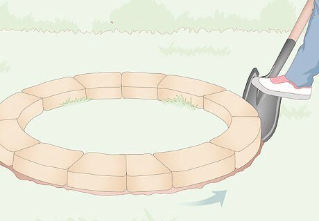 Push the tip of a spade into the soil around the ring to trace the outline. Plunge the tip of a spade into the soil on the outside of 1 of the blocks you just laid. Walk all the way around the ring, continuing to stab the tip of the spade into the ground outside the blocks as you go, until you have created a small trench in the soil around the ring. You’ll have to remove any grass sod and dig down into the ground to create a foundation for the pit, so this also gets that process started for you. If you want to create more of a buffer between the fire ring and any surrounding grass or soil, you can make the outline about 12–18 in (30–46 cm) bigger in diameter than the ring. That way, you will end up with a ring of gravel around the outside of the fire ring as well. However, this is totally up to you.