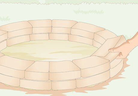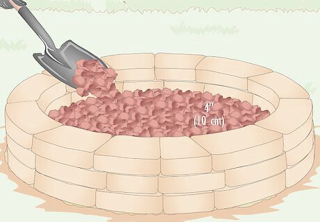 Fill the center of the fire ring with 4 in (10 cm) of lava rock or gravel. This will help with drainage when it rains and prevent the bottom of the pit from getting muddy. Red lava rock also looks nice and provides a contrast with the surrounding stone blocks. If you made the outline bigger than the ring, pour gravel or lava rock around the perimeter of the blocks as well.Tip: You can add a steel fire ring inside the stone ring to protect the blocks from charring and drying out over time. If you choose to do so, measure the inside diameter of the fire ring and purchase a steel fire ring that is the same diameter or smaller. Place it inside the stone ring and tap it into place with a rubber mallet to get it to settle in the gravel or lava rock. Don’t use river stones because they can crack and explode if they get too hot.