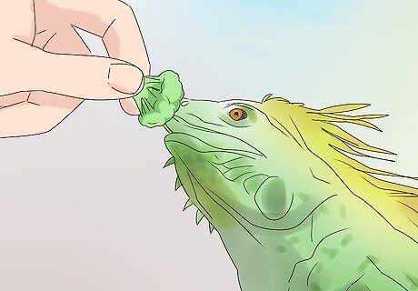 Be ready to feed it fresh leafy greens and produce. Iguanas are vegetarians, and they need fresh produce in their diet. You'll need to feed them leafy greens as at least 80% of their diet, including romaine, collard greens, mustard greens, cabbage, kale, parsley, broccoli, Swiss chard, and cilantro. About 10% or a little less should be reptile canned food or pellets, while the rest should be other fresh fruits and vegetables. Keeping fresh greens on hand can get expensive. Iguanas can eat veggies like squashes, sweet potatoes (cooked), carrots, cucumbers, and mushrooms. For fruit, try ones like apples, peaches, melons, mangoes, pears, strawberries, apricots, figs, and bananas (with the skin on).