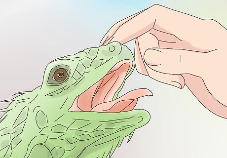 Look in its mouth for a bright pink mouth and tongue. Tap your finger gently on the iguana's nose, and it will usually open its mouth. You should see clear saliva, along with the pink tongue. A grayish or dull mouth could indicate sickness, as does stringy mucus. You may also see "cottage cheese" fungus or tiny fungus spots that may be green, yellow, or white. Avoid any iguana that displays these signs. If it doesn't open its mouth, you can gently try to pull it open.