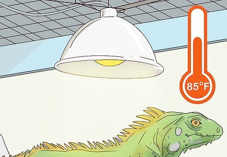 Purchase the appropriate heating equipment for the tank. All iguanas need heat lamps to help keep them warm. For a small iguana, 1 lamp is sufficient. However, for a full-grown adult, you'll need as many as 6 bulbs to make sure the iguana can maintain its body heat. You'll need to place these above the cage so the iguana can regulate its heat. Maintain a temperature of 85 °F (29 °C) for your iguana. Keep one area at 120 °F (49 °C) at least so your iguana can get warm. Avoid hot rocks and heating pads that provide heat from below. Heat from above the iguana engages a sensory organ called the parietal eye that tells it to start basking and regulate its heat. When the heat comes from below, this organ is not used, and the iguana may not realize it is getting hot or even burned. Keep in mind that if you're housing the iguana inside, this heat output could increase your electricity bills in the summer when you're trying to cool the house down with the air conditioner.