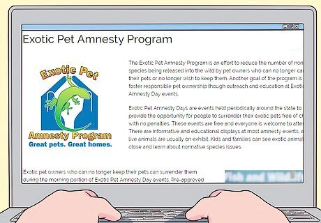 Look for an exotic pet amnesty program to see if they re-home iguanas. Because some owners release iguanas into the wild when they don't want to care for them anymore, some states have amnesty programs. Basically, anyone can surrender a pet, even if it's exotic or illegal, and it will be re-homed. If your state has such a program, you may be able to get an iguana by applying to be a designated home through the amnesty program. Florida, for instance, has one of these programs where iguanas can be surrendered. Search your local government's website to see if you have an amnesty program nearby.