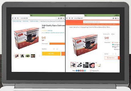 Comparison shop for the pots and pans you need. Identify the model of each piece you need, write down the price one retailer lists it at, then find the same model on the sites of 2 to 3 other retailers. Write down that price as well. Repeat until you've identified at least 2 prices for each piece you need. Then determine which combination of pieces you can afford based on how much you budgeted. The websites of brick and mortar retailers are good places to start. Look for deals online and in circulars. Also, consider purchasing your cookware in November during Black Friday, or in May when retailers often offer deep discounts in anticipation of the summer wedding season. Visit the kitchen aisle of a well-established department store. Knowledgeable salespeople can advise you about which types of cookware fit your needs, as well as about good deals.