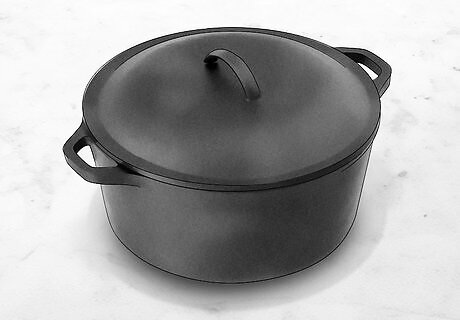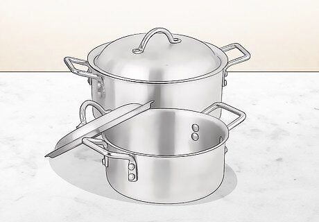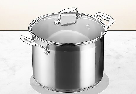 Obtain a stockpot for steaming and boiling food. Make sure your stockpot is sturdy and has wide enough handles to be able to lift it with your fingers protected by potholders or oven mitts. Buy an 8 US qt (7.6 L) for typical household use, though if you plan to prepare a lot of pasta, stews or, soups, a 12 US qt (11 L) to 18 US qt (17 L) stockpot may be better. Opt on the larger side (12 US qt (11 L) to 18 US qt (17 L)) if you plan to make dishes with large pieces of meat, such as whole chicken stew or corned beef and cabbage. You can buy a colander – used for straining water – as an insert if your existing stockpot doesn't have one. This will help you easily separate cooked pasta or steamed vegetables from the boiling water they were cooked in.