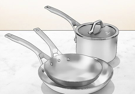 Acquire a 3 US qt (2.8 L) sauté pan for a variety of meals. Use a sauté pan for rice dishes, stir-frying vegetables, and searing meats. Find a sauté pan with a thick base to ensure your food cooks evenly, as well as a tight-fitting lid to keep heat in and food moist. The sauté pan is the most versatile of your cookware set as it can be used to prepare many types of meals. Use your sauté pan to sear a cut of beef or brown chicken for extra flavor. Or use it for casseroles, chili, or curries.