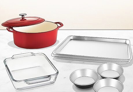 Buy additional items depending on your budget and storage space. Most cookware sets will have the pieces mentioned above. To expand the range of dishes you'll be able to prepare, supplement those pots and pans with other cookware items many consider indispensable. These include: Dutch ovens: These pots can be used on a stovetop or in an oven and are often used to prepare soups, stews, or braised foods. Baking sheets or sheet pans: Use these for foods you'll cook in batches like cookies and biscuits. Glass baking pans: Bake macaroni and cheese, pasta dishes, marinated meats, and casseroles in these sturdy Pyrex pans. Pie pans: Purchase standard-size (9 in (23 cm)) glass pie pans to prepare quiches and pies.