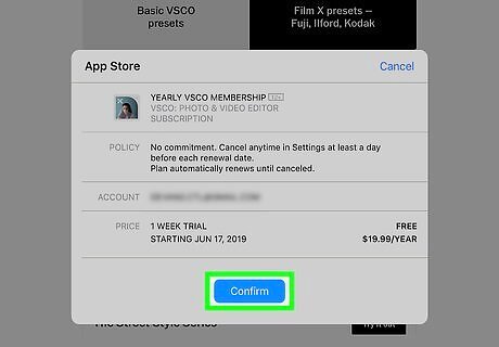 Tap the blue Confirm button in the pop-up. This will confirm your action, and start your free trial. Depending on your App Store settings, you may be required to enter your Apple ID password, Touch ID, or Face ID to authorize your purchase.