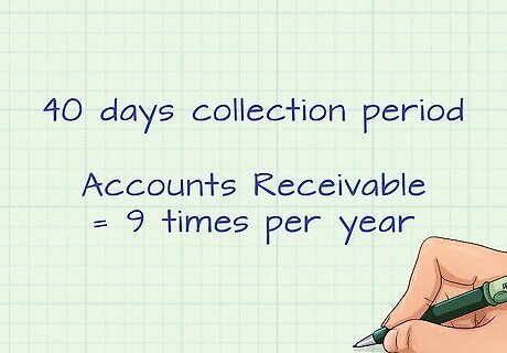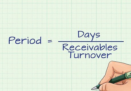 Input the variables. Using the information from the earlier example, we have a company with $730,000 in net credit sales and an average accounts receivable of $80,000. This results in a receivable turnover ratio of 9.125. This data was measured over a year, so 365 will be used for the top of the equation. The completed equation now looks like this: P e r i o d = 365 9.125 {\displaystyle Period={\frac {365}{9.125}}} Period={\frac {365}{9.125}}. The top of the equation, the number of days, should be substituted for the number of days in the period being measured. 365 is usually used for a whole year, 180 for a half year.