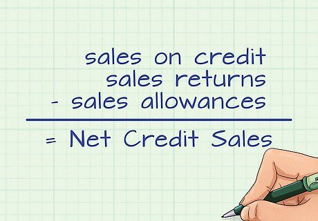 Determine net credit sales. Net credit sales equals all of the sales on credit less all sales returns and sales allowances. Sales on credit are non-cash sales where the customer is allowed to pay at a later date. Sales returns are credits issued to a customer due to a problem with the purchase. Sales allowances are reductions in price granted to a customer due to problems with the sales transaction. If a company grants a large amount of credit, even to customers with a poor credit history, its net credit sales will be higher. Use this equation: sales on credit – sales returns – sales allowances = net credit sales.