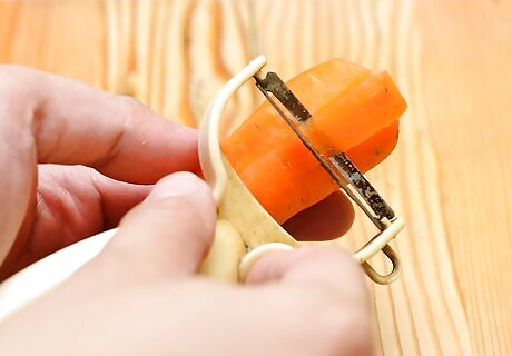Peel the carrots. You can do this either with a paring knife or a potato peeler. Take the knife or peeler and cut free the outer skin of the carrot. Once you are finished, you can throw away the peeled skin or compost it.