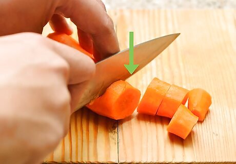 Re-rinse and cut the carrots into smaller pieces. After peeling, you should rinse your carrots again in cool water before cutting them with a suitable knife, like a paring knife. Be careful not to cut your carrots no thinner than about /8 of an inch (.32 cm) thin. They'll be cooked in your pressure canner, and smaller pieces can become mushy. Depending on the thickness and length of your carrots, you may only need to cut them lengthwise. Longer carrots might need to be cut lengthwise and then into parts widthwise.