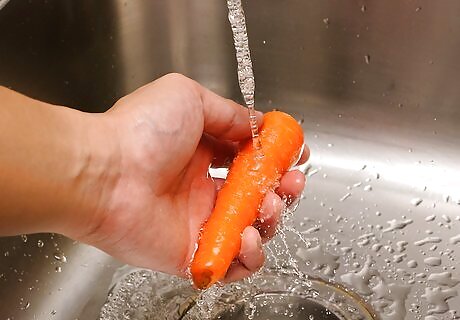 Wash the carrots. Running cool water over your carrots should be enough to remove bacteria and dirt from your carrots, especially if they are relatively clean. If your carrots are fresh from the garden or quite dirty, a stiff bristle brush can help you remove dirt from their surface.