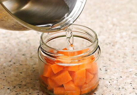 Pack the jars with carrots. You should use the method that works best for you. In some cases, you might find that you can pour the hot water and carrots into the jar from the pot. For large quantities, this might not be feasible, in which case you might want to use tongs to remove the carrots. Carrots should be packed relatively tightly in the jars and each jar should have about 1 in (2.5 cm) of open space between the top of your carrots/water and the lip of the jar. If you removed your carrots with tongs, you'll need to pour the boiling water into the jars with the carrots.