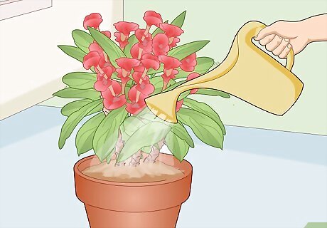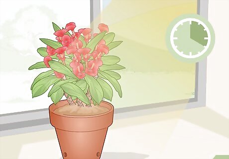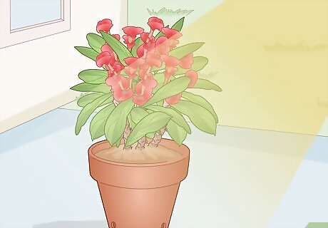 Set an indoor pot in a spot that gets 4+ hours of sunlight. If the crown of thorns receives at least this much daily sunlight indoors, it may flower all year round instead of only from late spring through early fall. Even if this isn’t possible in your case, aim to give the plant as much sunlight as possible. Ample direct sunlight can, however, heat up a windowsill beyond the plant’s preferred temperature range of 60–96 °F (16–36 °C). If you see wilted or discolored foliage due to overheating, move the plant back a bit from the window or relocate it to a somewhat less sunny spot.