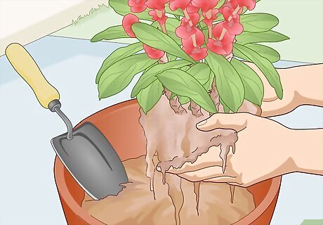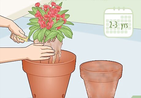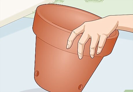 Choose a sturdy pot with numerous drainage holes. Crown of thorns plants come in a range of sizes based on age, variety, and other factors, so select a pot that looks to be appropriately sized for your plant. Pick a sturdy pot material, such as terra cotta, especially if you plan to keep the plant outdoors part- or full-time. Most importantly, choose a pot with lots of holes in the bottom so that it drains quickly. A smaller pot should have at least 4 holes in the bottom, while larger pots should have 6 or more. Place a 1–2 in (2.5–5.1 cm) layer of gravel or broken terra cotta in the bottom of the pot to prevent the drainage holes from getting clogged up with soil. If you plan to keep the plant indoors, place a tray underneath the pot to collect the water that drains through the holes.