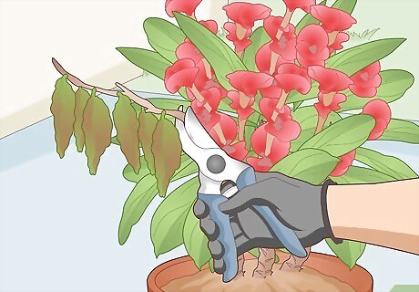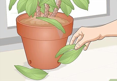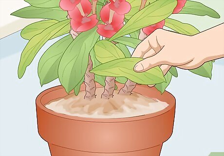 Remove and discard fallen leaves and flowers regularly. If you have kids or pets around, it’s essential to get rid of all fallen leaves and flowers. Crown of thorns plants are poisonous, and a child or pet who eats any leaves or flowers may develop severe mouth irritation, gastrointestinal distress, and, in rare cases, internal bleeding. Contact a poison control center or doctor if you suspect a child has eaten crown of thorns leaves or flowers, and call your pet’s veterinarian in the same scenario. Clearing away fallen leaves and flowers helps the soil to "breathe" and reduces the risk of the plant developing "gray mold," which is a fungus that can kill your crown of thorns. Immediately remove any leaves, flowers, or stems that have a fuzzy gray-brown mold on them.