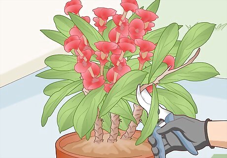 Prune the plant lightly for shaping in the spring. A crown of thorns plant doesn’t really require any pruning, so do only minimal pruning if you want to adjust its shape slightly. Use sharp pruning shears to create clean cuts about 0.25 in (0.64 cm) above the base of any stems or branches you want to trim. Discard the cuttings right away. The best time to prune for shaping is in early-to-mid spring, before the plant’s primary growing season. Remember to put on your gloves and eye protection first, and to disinfect your tools afterward.