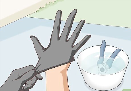Put on protective gear before pruning and disinfect your tools afterward. While it’s safe to pick up dried, fallen leaves or flowers with bare hands, never pluck or cut living parts of the plant bare-handed. Put on thick gardening gloves and, as an extra safety measure, wear eye protection. Clean your tools thoroughly when you’re finished as well. The viscous, milky ooze inside of the leaves and stems contains the plant’s poison. It will cause severe irritation to any scrapes or cuts on your skin, and can even cause temporary blindness if it gets into your eyes. If you use pruners or scissors, rinse them under warm water and wipe them thoroughly with a rag soaked in rubbing alcohol.