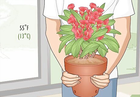 Bring in an outdoor pot when the temperature falls below 55 °F (13 °C). Basically, when the nighttime temperature regularly dips to 60 °F (16 °C) or below, it’s time to bring your crown of thorns indoors for the season. Choose a spot in your home that meets the recommended indoor growing conditions and keep it there until the temperature consistently warms up again. As a temporary measure on a chilly night, move the pot into a garage or cover it with a towel or sheet. If you live in a cooler climate, it’s much easier to just grow your crown of thorns plant indoors!
