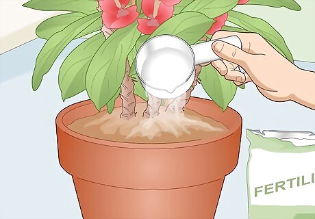 Add a water-soluble, diluted fertilizer monthly. Buy a general-purpose houseplant fertilizer that’s made to be mixed in water. Follow the mixing instructions, but double the amount of water in order to dilute the mixture by half. Pour the mixture onto the soil in the plant pot. If, for example, the instructions say to use 4 fl oz (120 ml) of water for the mixture, use 8 fl oz (240 ml) instead. As a desert plant, the crown of thorns thrives in poor soil.