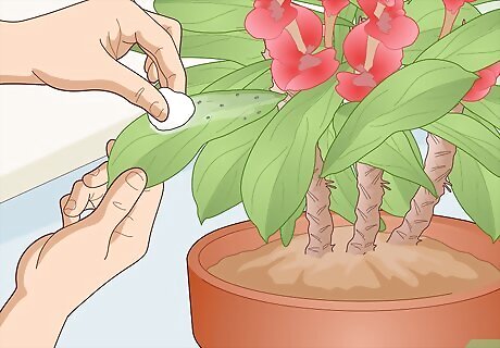 Wipe away any small pests with a soapy cotton ball or swab. Crown of thorns plants typically don’t draw in a large number of pests, but you may occasionally spot some spider mites, aphids, or other small critters on the stems and leaves. Take a good look at the plant every 2-3 days. If you see any pests, soak a cotton ball or swab in a mixture of water and dish soap, then simply wipe away the little critters! If there are more than a handful of pests, bring a dish of soapy water to the plant and keep re-dipping the cotton ball or swab as you work. The soapy water will quickly kill the pests.