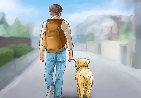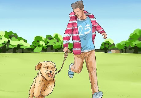 Exercise your dog. Your Labradoodle will need high energy exercise every day. He is a great pet to powerwalk and run with. He is sturdy and energetic, so he will make a great running partner. You can also play fetch and other high energy activities with him. This will keep him active, happy, and help burn off some of his energy. If you don’t exercise him enough, he may be more likely to act out his energy in other ways, such as chewing, barking, or digging. Wait until he is older than nine months to run with him. If he is any younger, his legs will not be developed enough.