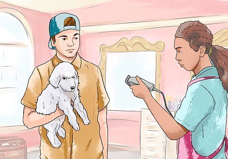 Take him to the groomers. While your Labradoodle is still a puppy, you can start taking him to the groomers every few weeks or months so he gets used to it. After he is about a year old, he will need to be taken to the groomers every four to six months to get a fur trim. Many owners like to take their Labradoodle to the groomers in between these visits, about every four to six weeks, to maintain his coat, have his nails looked at, and have him bathed.