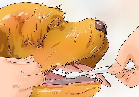 Brush his teeth. Your Labradoodle’s teeth are important, so you need to brush them once a week. Start by using your finger with dog toothpaste, then move up to a gentle pass with a dig toothbrush the next day, then finally get to where you can brush all his teeth the day after that. It will get easier as he gets used to the process. Never use human toothpaste on a dog because it is toxic.